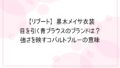 衣装そのものを特定するのは難しくても、「似ているデザイン」を探す楽しさも衣装チェックの魅力のひとつです。