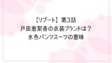 戸田恵梨香さんが着用していた水色パンツスーツのブランドや衣装の意味については、こちらの記事で詳しくまとめています。